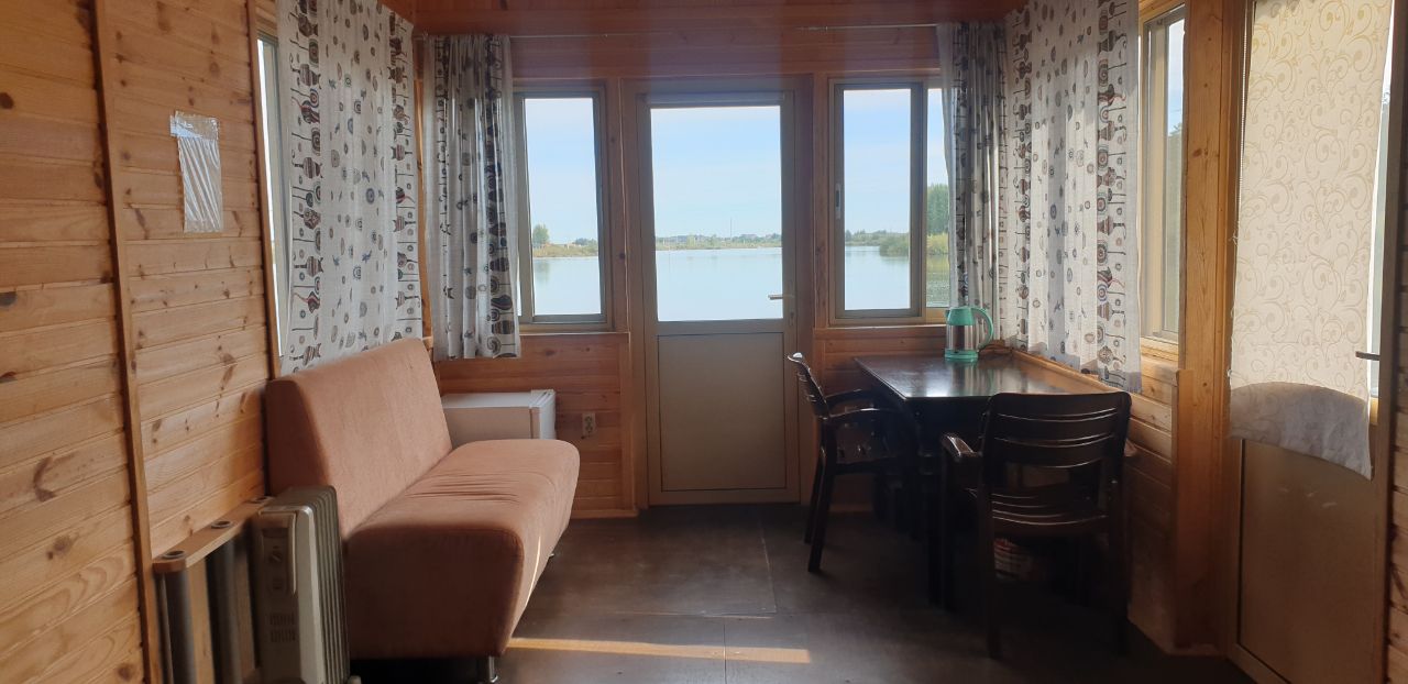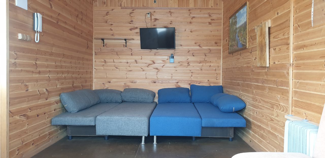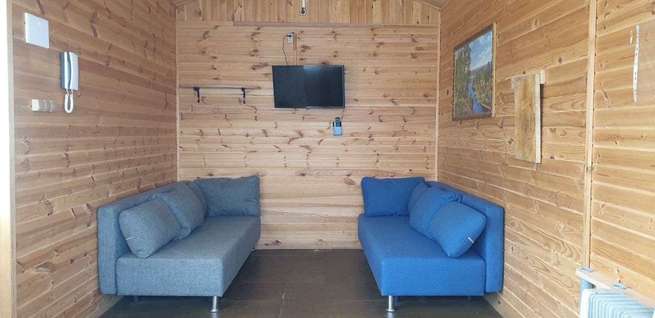Простота и уют. Внутри — два раскладных дивана, общая зона для отдыха, телевизор, холодильник и электрочайник. Постельное бельё гостям не предоставляется. Санузел — блочного типа, благоустроенный, находится рядом.
